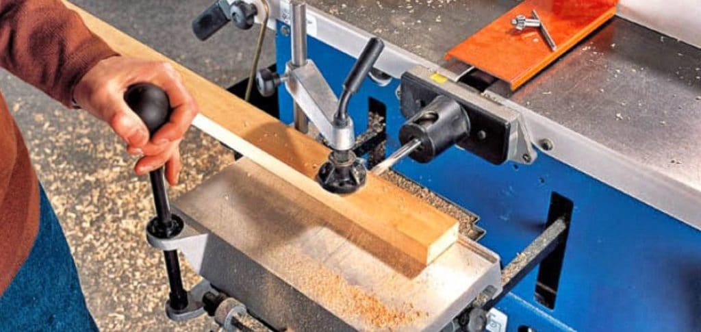 - Fixez la pièce sur la table de mortaisage à l’aide des presseurs. Réglez la butée de profondeur puis, à vue, la hauteur de la table en alignant la mèche sur le tracé de la mortaise.