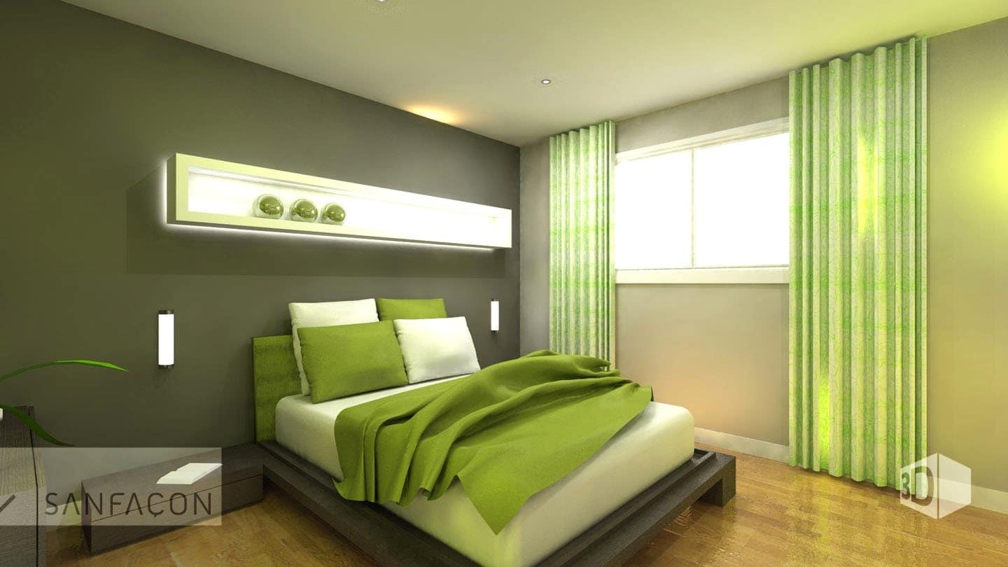 Les touches de vert un peu flashy ajoutent au charme de cette chambre. Il semble que la nature pénètre un peu dans cet espace très lumineux. L’ambiance est paisible et invite à un repos bien mérité !
