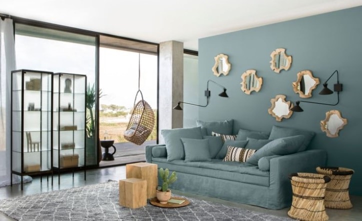 Le tapis gris bleu se marie parfaitement avec la teinte gris bleu du mur et du canapé. Les matières naturelles telles que le bois et l’osier viennent compléter cet ensemble. Une belle ambiance entre bohème chic et classicisme. La douceur de cette pièce est très agréable.