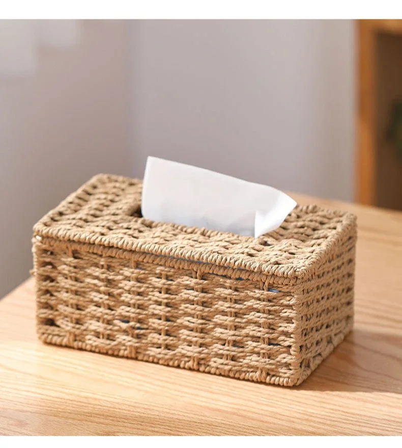 Ce porte-mouchoirs est fabriqué en fibres naturelles tressées, comme de la paille, de l’osier ou de la corde de papier, et intègre un cadre interne en fer pour une robustesse accrue.