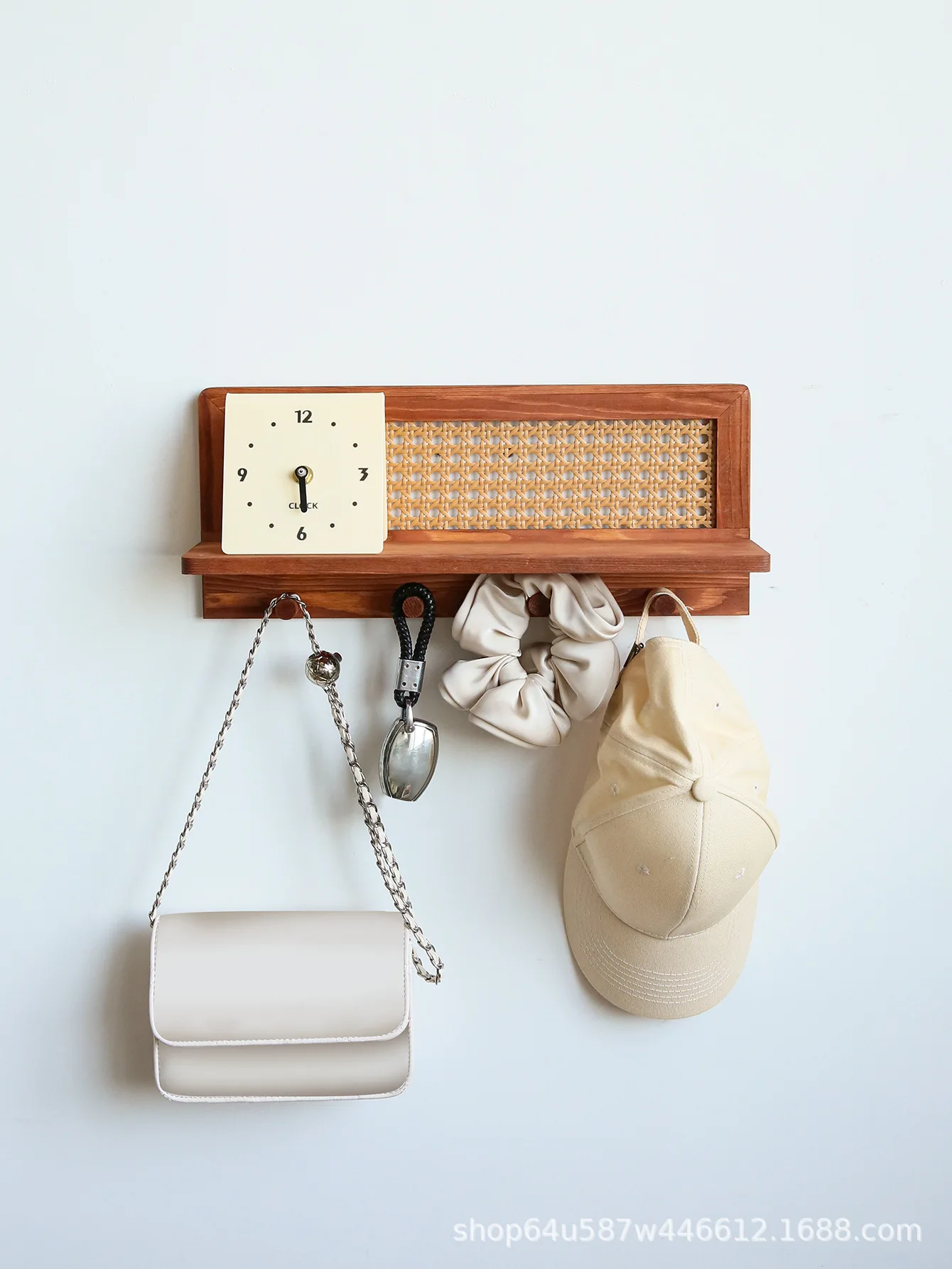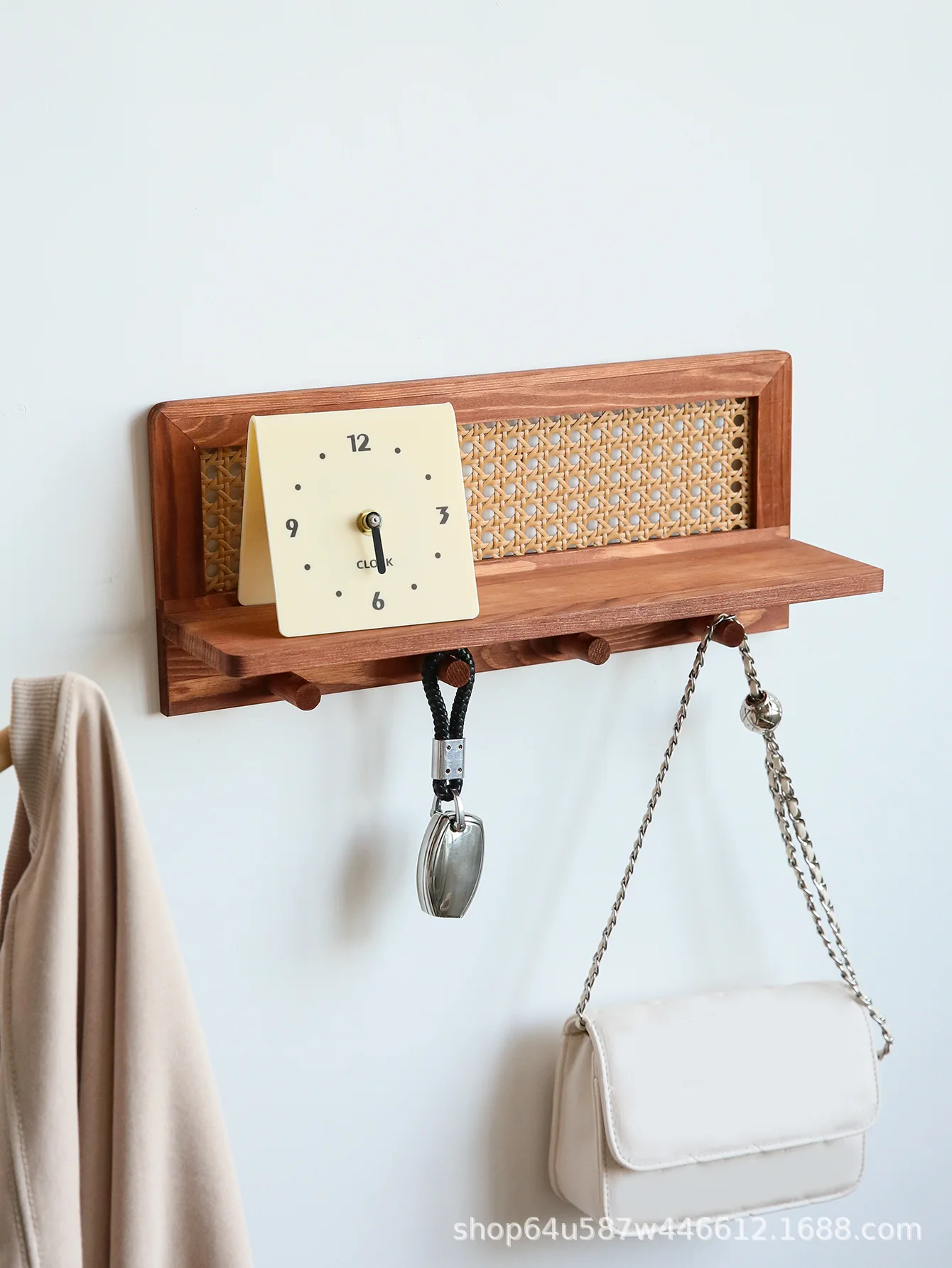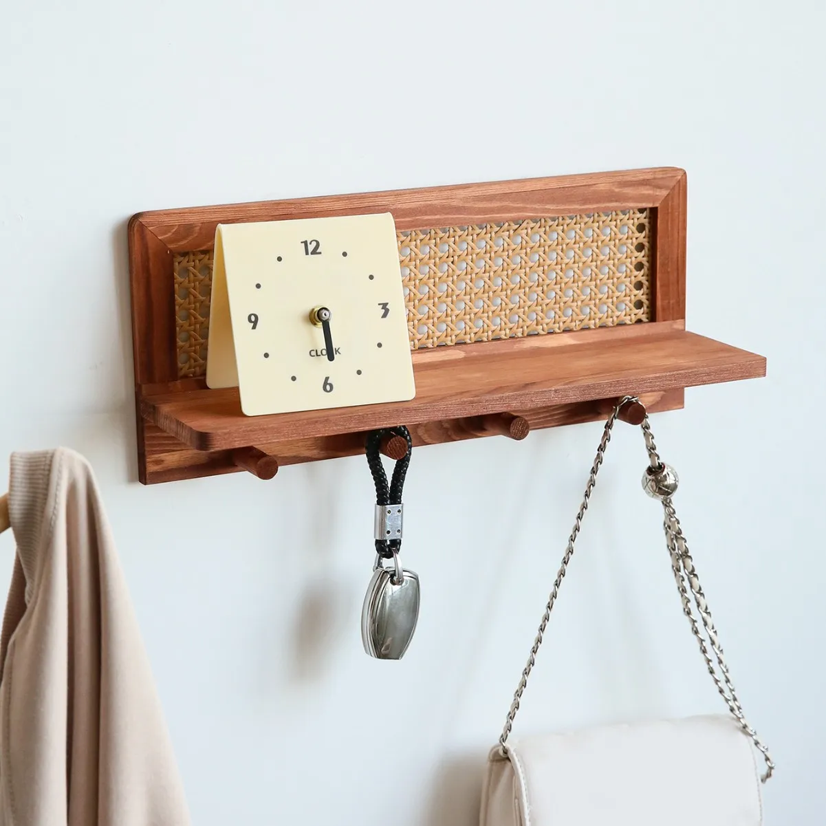L’étagère est fabriquée avec une structure en bois clair au fini naturel et un fond en cannage de rotin tressé.