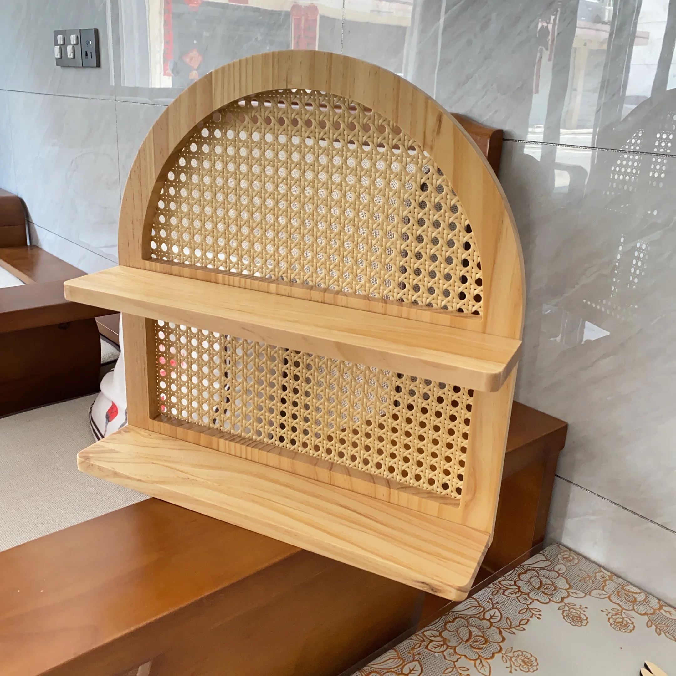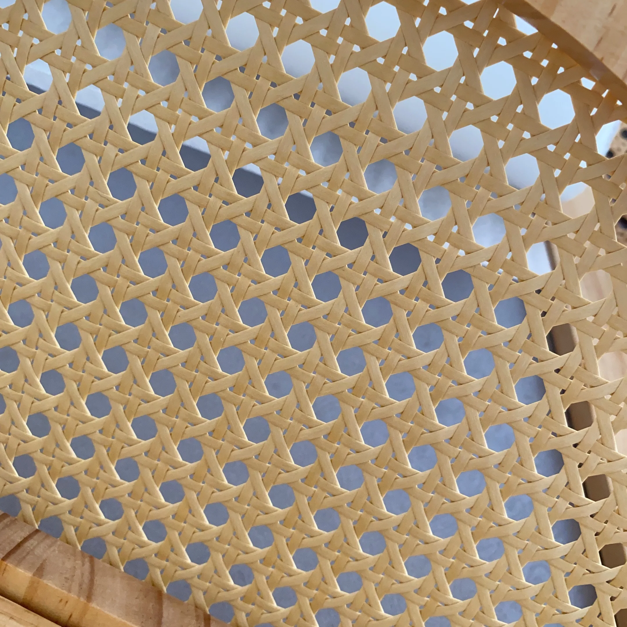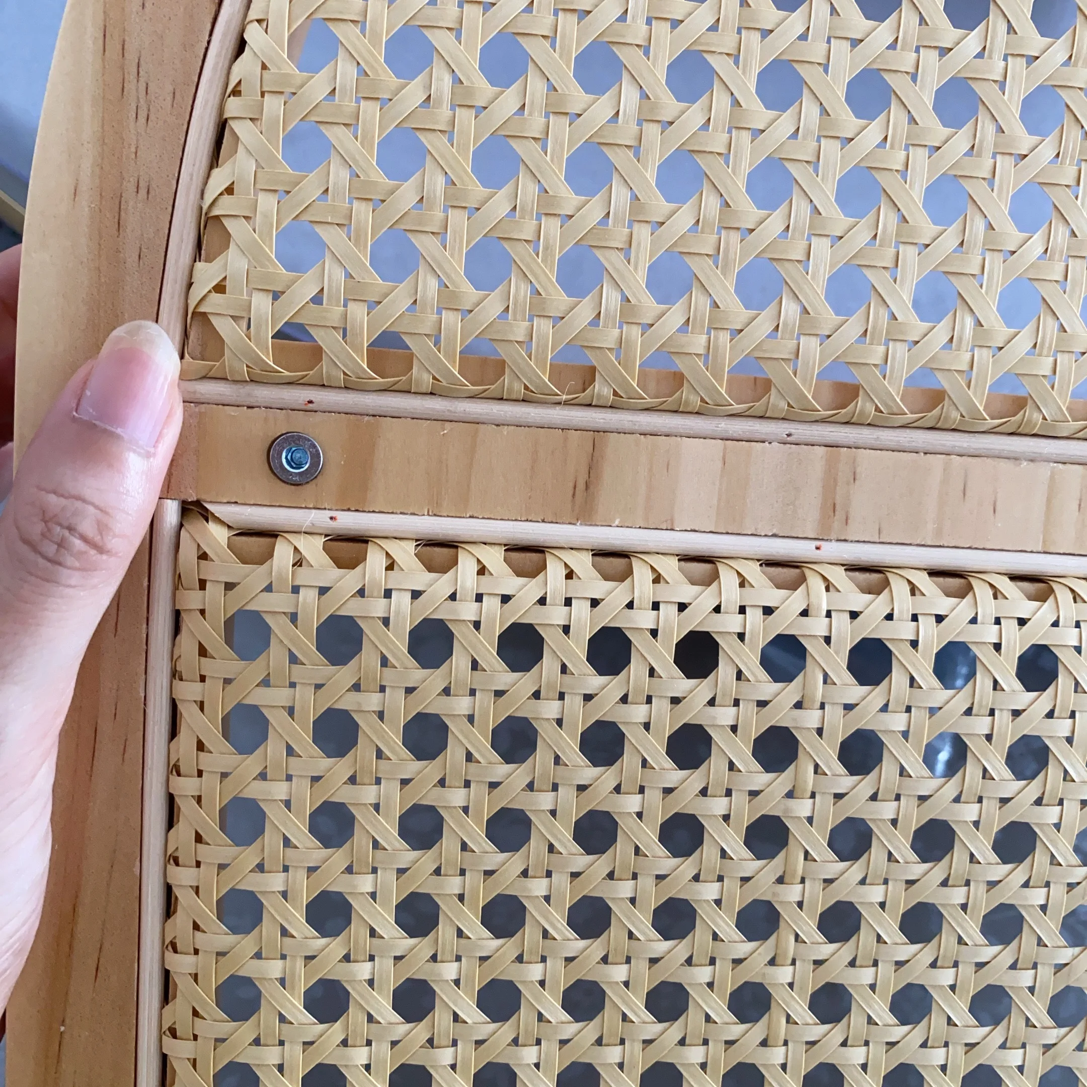 - Matériaux : structure en bois clair naturel (pin), fond en cannage de rotin tressé.