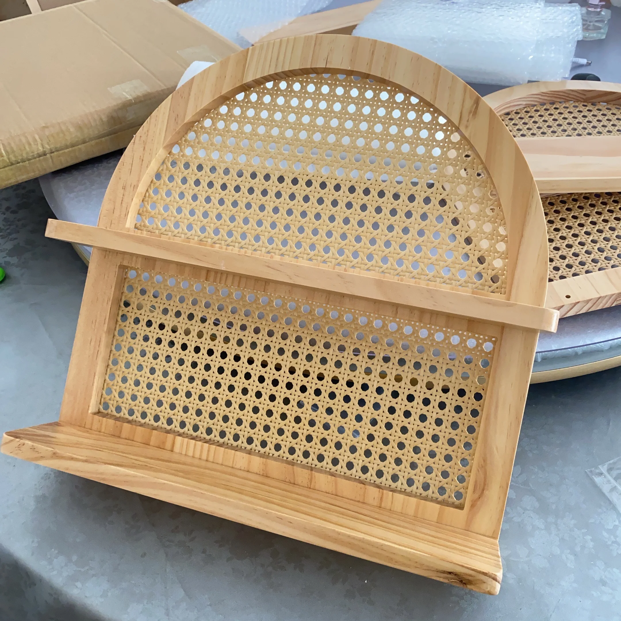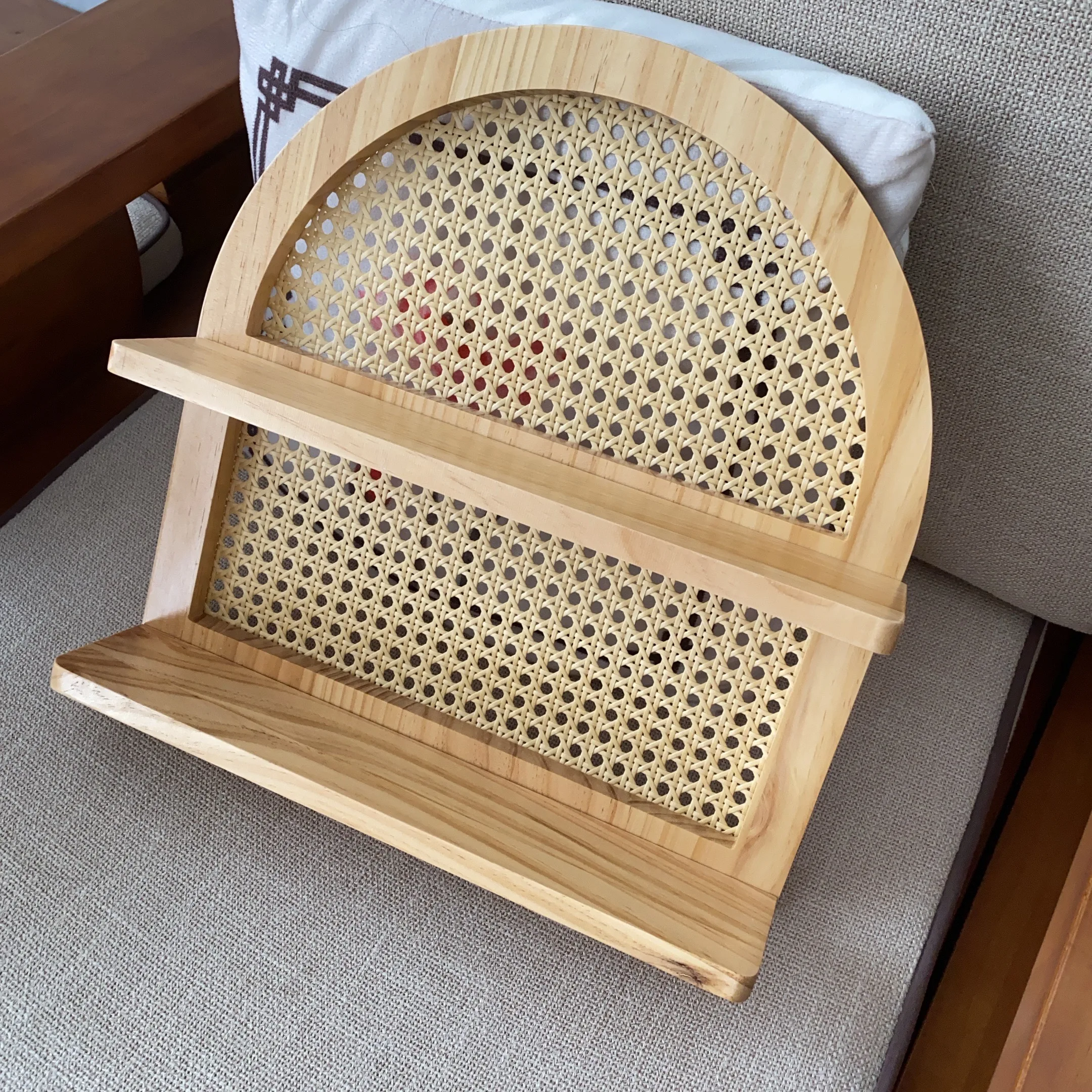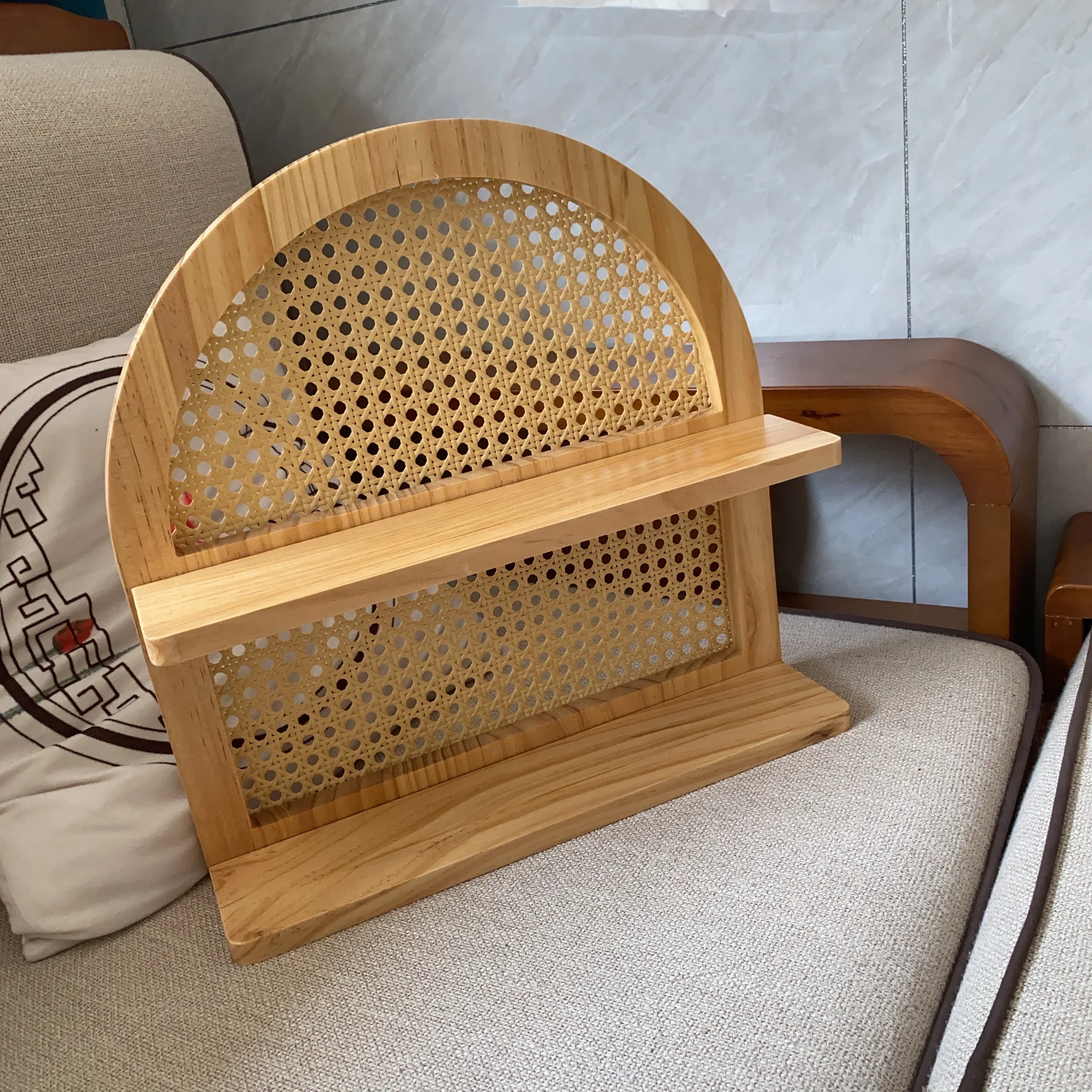 - Matériaux : structure en bois clair naturel (pin), fond en cannage de rotin tressé.