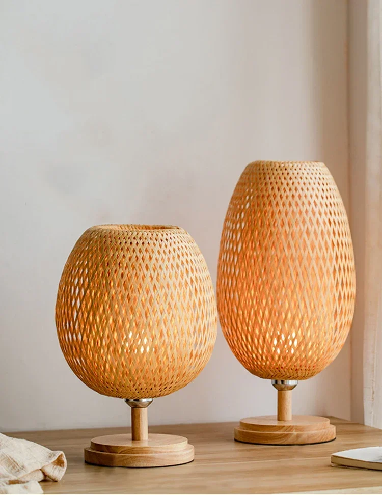 L’abat-jour est confectionné en bambou ou en rotin tressé artisanalement, et la lampe repose sur une base en bois naturel.