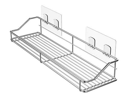 Très bel organiseur de salle de bain à fixer au mur sans clou ni vis. Des adhésifs portent de larges crochets, 1 de chaque côté du panier de rangement. Supporte de lourdes charges. Le panier principale peut contenir 5 flacons de gel douche, sur le côté droit un porte savon et juste en dessous 2 porte fleurs de douches ou gants ou encore rasoir. Dimensions: 30,5 x 14 x 14 cm. Acier inoxydable.